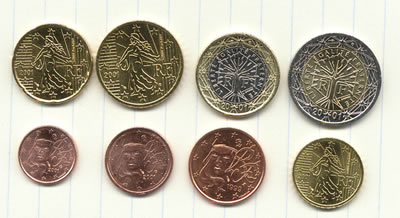 Euro (€) = 100 cents. Notes are in denominations of €500, 200, 100, 50, 20, 10 and 5. Coins are in denominations of €2 and 1, and 50, 20, 10, 5, 2 and 1 cents.